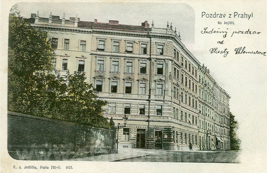 Na bojišti se odpradávna říkalo celému okolnímu prostoru podle krvavé bitvy, která zde byla svedena v roce 1179 mezi přemyslovskými knížaty Bedřichem a Soběslavem. V době pořízení snímku se tak jmenovala jen ulice a nárožní dům s restaurací, n.čp. 1950. Je zřejmé, že projekt domu již počítal se zřízením restaurace v přízemí, což svědčí o předvídavosti a podnikatelském duchu majitele, který správně usoudil, že se počet obyvatel v okolí a tím i hostů restaurace bude neustále zvyšovat. Celý blok domů byl postaven na části velké zahrady kolem roku 1895. V té době byl jeden z prvních, které začaly vyrůstat v této málo zastavěné oblasti Karlova, kde kromě zahrad stály převážně lékařské a sociální ústavy. KOLOROVANÝ SVĚTLOTISK. F. J. JEDLIČKA, 1903 |