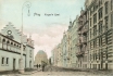 Třípatrový nájemní dům po pravé straně, čp. 230, sousedící s lázněmi, měl v době asanace fádní klasicistní fasádu - je však nepochybné, že šlo o objekt staršího původu. Jeho boční křídla svírala čtvercové nádvoří, kde byly dílny několika řemeslníků, jak to prozrazují jejich firemní tabule na domě. Ty společně s plakátovací plochou se zajímavými dobovými reklamami alespoň trochu zpestřují zmiňovanou fádnost fasády. Propaguje se zde tinktura proti hmyzu (100 dukátů za štěnici!), minerálka Grünská kyselka a limonádové bonbony A. Maršnera. Najdeme tu ale i pozvání na schůzi jakési instituce a na koncert. Před domem vidíme také jednu z typických dobových profesí - brusiče nožů při práci. Další dům, s komínem, má čp. 231 a stojí na rohu Vojtěšské ulice. Vyčnívající dům uprostřed v pozadí je již v Pštrossově ulici. Vlevo se nachází poněkud noblesnější dům čp. 229, také ze starší zástavby. Za ním již stojí dvě novostavby, čp. 1739 a 1740, které po zboření většiny okolních domů v roce 1903 budou tvořit základ pro výstavbu nové ulice. FOTOGRAFICKÁ POHLEDNICE. SNÍMEK KOLEM 1900. Z. REACH, 20. LÉTA |