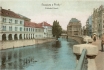Díváme se na skupinu Šítkovských mlýnů, které nestály v cestě výstavbě nového nábřeží a zůstaly zachovány. Počítalo se však s tím, že budou zbořeny později - stalo se tak v roce 1927, kdy zde byla postavena budova SVU Mánes. Její průčelí však již navazovalo na linii zábradlí, končící původně, jak je vidět na snímku, u druhé řady oken starého objektu čp. 249. Budova uprostřed, čp. 251, byl válcový mlýn. Soudě dle nápisů na obou stranách měl nejspíš dva majitele, A. Kopeckého a J. Vávru. O poctivé a solidní práci stavitelů mlýnů svědčí skutečnost, že při bourání se jen s velkými obtížemi podařilo rozrušit jejich velmi pevné základy. Zároveň bylo třeba vytáhnout několik stovek pilot, zaražených hluboko do říčního dna. FOTOGRAFICKÁ POHLEDNICE. SNÍMEK KOLEM 1904. Z. REACH, 20. LÉTA |