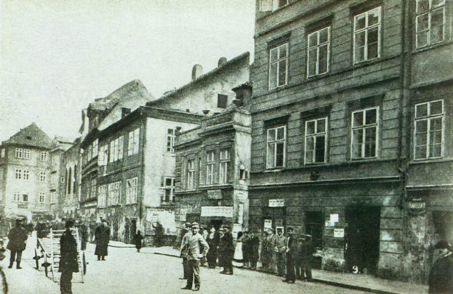 Byla svými asi 400 metry nejdelší komunikací Židovského Města. Na západě ústila do Kaprové ulice, na severovýchodě pak na ni navazovala ulice Vězeňská. Snímek pořízený krátce před demolicí její jižní uliční fronty názorně dokládá, jak živá tato ulice bývala. Tři domy zprava mají čp. 92, 91 a 90 (ve starém domě na je ho místě bydlel kdysi rabbi Löw [asi 1520-1609] - tvůrce pověstného Golema). Za nimi ústí do Josefovské třídy původní ulice Meislova. V pozadí před domem čp. 115 vystupujícím do ulice vidíme budovu Nové synagogy s vysokými okny, čp. 113. Všechny domy na snímku budou zbořeny v letech 1896-1898. FOTOGRAFICKÁ POHLEDNICE. SNÍMEK 1896. Z. REACH, 20. LÉTA |